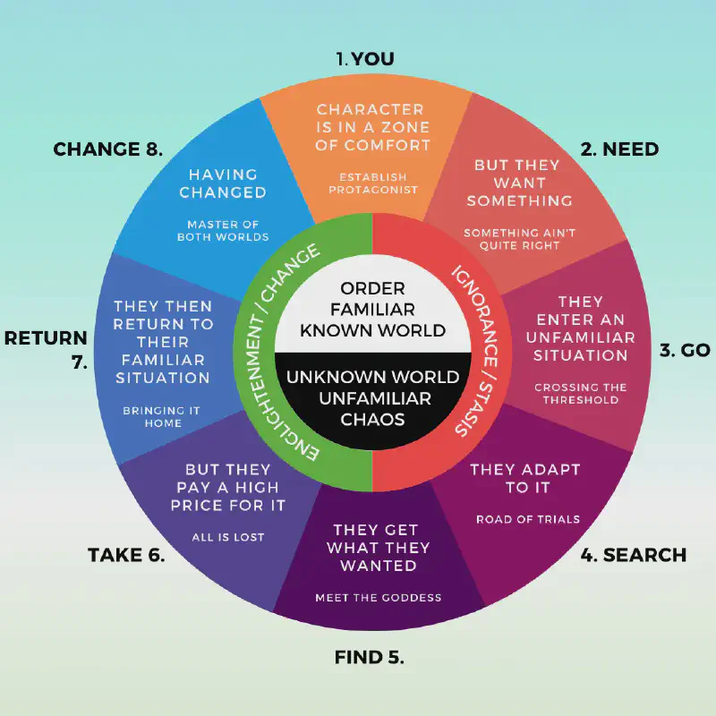 Esta película se ajusta muy bien al “camino del héroe”, por otro lado, una serie de etapas que según Joseph Campbell seguían todas las historias de la mitología y que garantizan que uno se sienta fuertemente identificado con el personaje. Un resumen del proceso, adaptado a las historias modernas, se ve acá (post original):